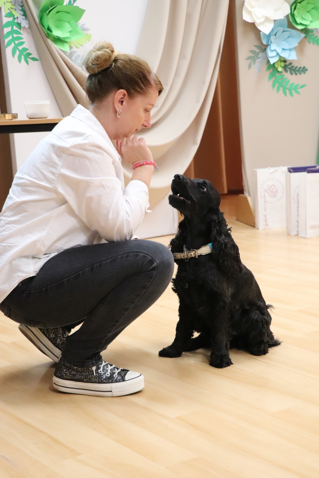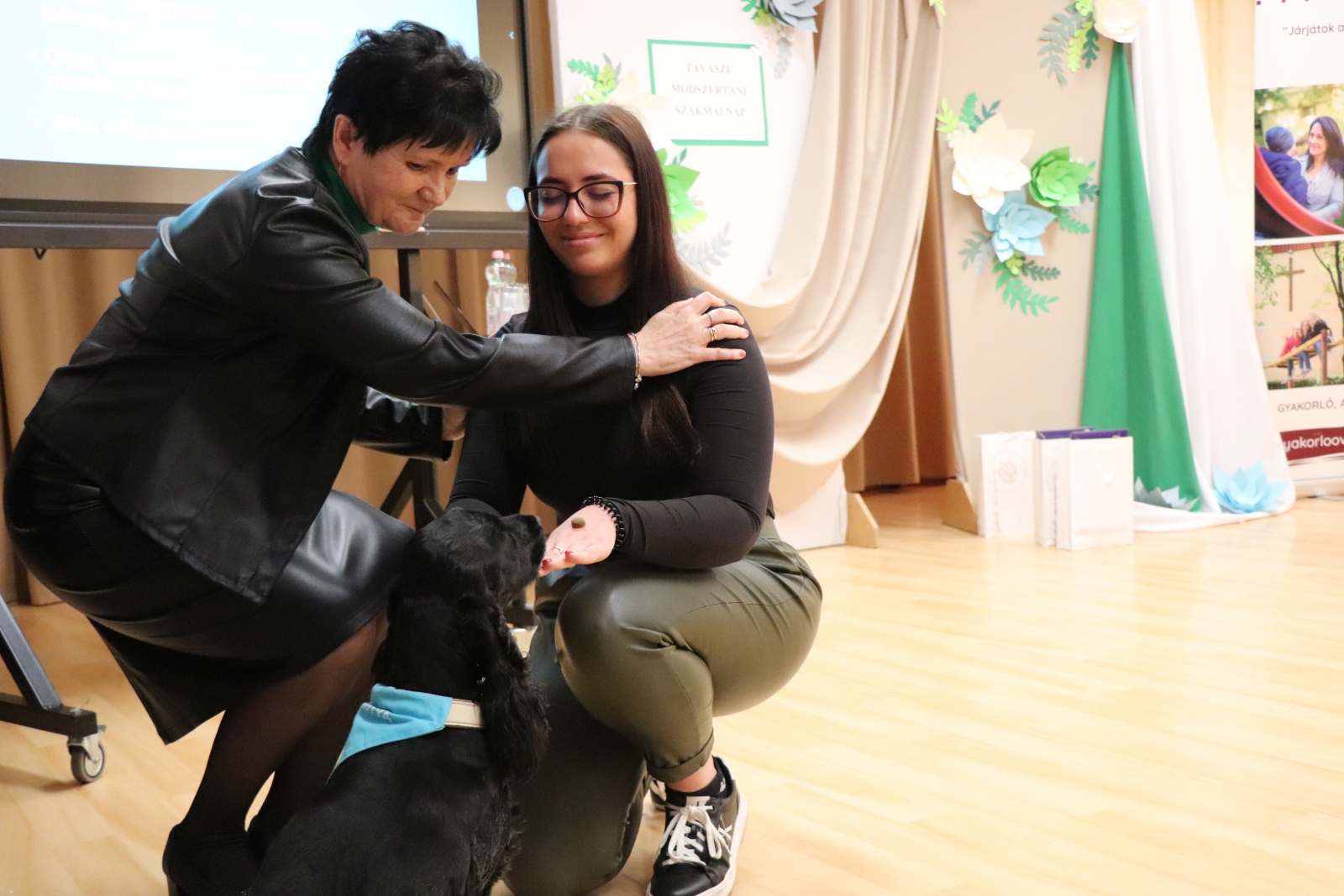 A foglalkozások alatt, segít a gyerekeknek, a kutyával való együttműködésben, és figyel a kutyára.